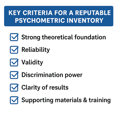 Learn about the key criteria a reputable psychometric inventory should provide evidence to support its use.